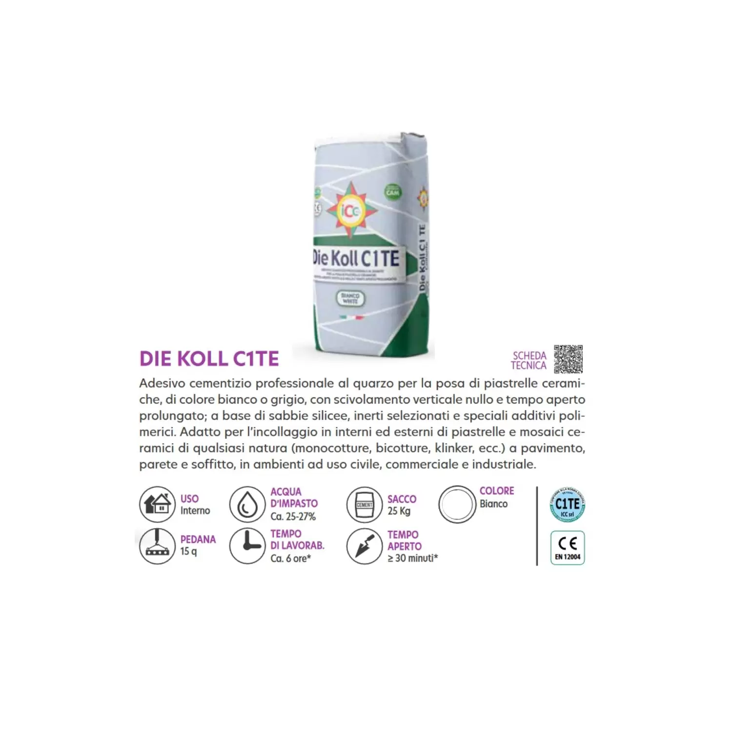 DIE KOLL C1TE è un adesivo cementizio (C) normale (1), resistente allo scivolamento (T), con tempo aperto prolungato (E) conforme alla norma vigente EN 12004. La conformità di DIE KOLL C1TE è comprovata dai certificati ITT emessi dal laboratorio notificato MODENA CENTRO PROVE srl. DIE KOLL C1TE è un adesivo in polvere di colore bianco o grigio, a base di cemento Portland, sabbie silicee, sabbie selezionate provenienti da riciclo e speciali additivi polimerici che ne esaltano la lavorabilità e l’adesione. Impastando DIE KOLL C1TE con sola acqua si ottiene una malta di facile lavorabilità, alta adesività e tissotropia, tale da poter essere applicata in verticale senza colare e senza lasciar scivolare le piastrelle, anche di grande peso. Grazie alla sua speciale formulazione, riesce a contrastare la riduzione dei tempi di lavorabilità e di registrazione causata dalla porosità dei sottofondi e dall’assorbimento delle piastrelle garantendo un tempo aperto prolungato ed un’ottima lavorabilità. DIE KOLL C1TE indurisce senza subire ritiri apprezzabili fino ad assumere una notevole resistenza meccanica, aderendo perfettamente a tutti i materiali di normale uso in edilizia.
