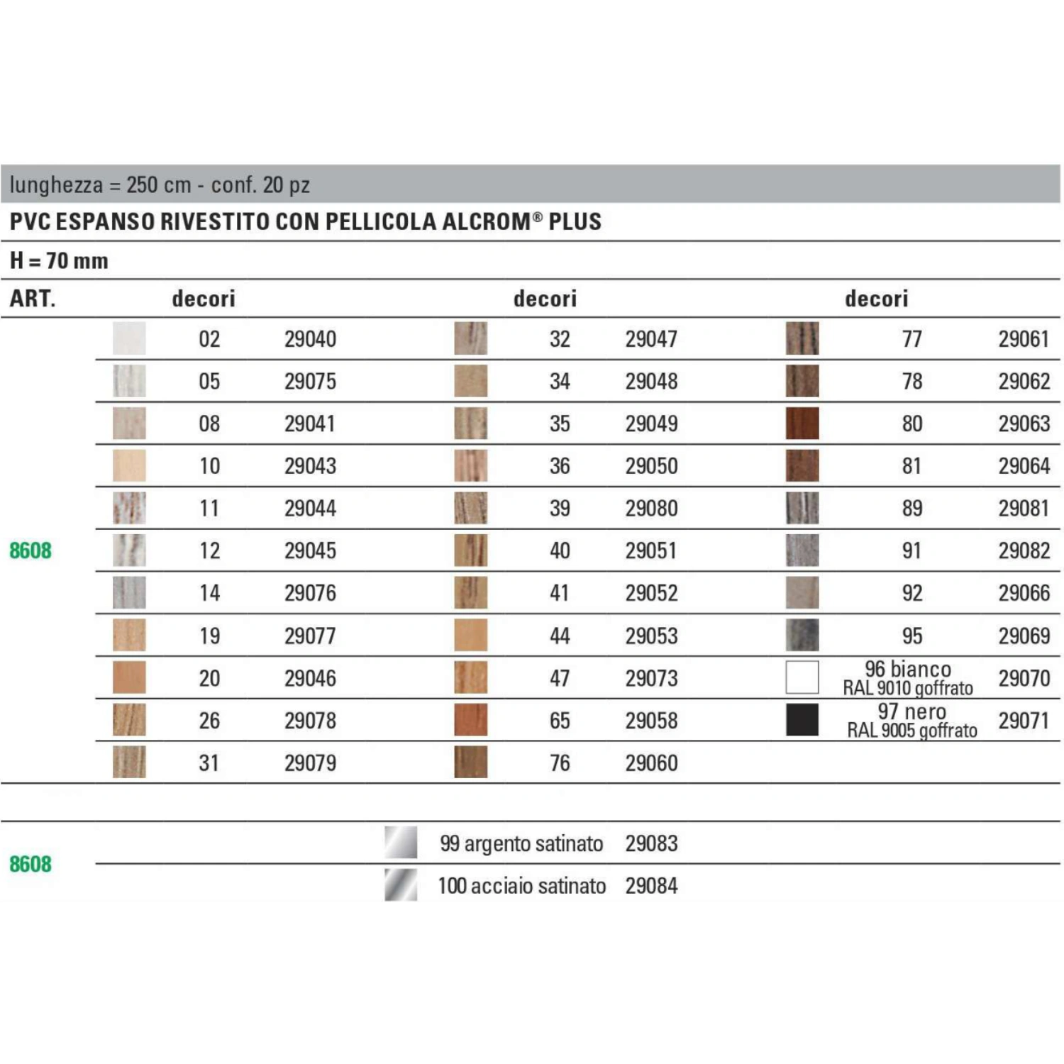| COLORE PROFILO | ALCROM-02, ALCROM-05, ALCROM-08, ALCROM-10, ALCROM-11, ALCROM-12, ALCROM-14, ALCROM-19, ALCROM-20, ALCROM-26, ALCROM-31, ALCROM-32, ALCROM-34, ALCROM-35, ALCROM-36, ALCROM-39, ALCROM-40, ALCROM-41, ALCROM-44, ALCROM-47, ALCROM-65, ALCROM-76, ALCROM-77, ALCROM-78, ALCROM-80, ALCROM-81, ALCROM-89, ALCROM-91, ALCROM-92, ALCROM-95, ALCROM-96, ALCROM-97, ALCROM-99, ALCROM-100 |