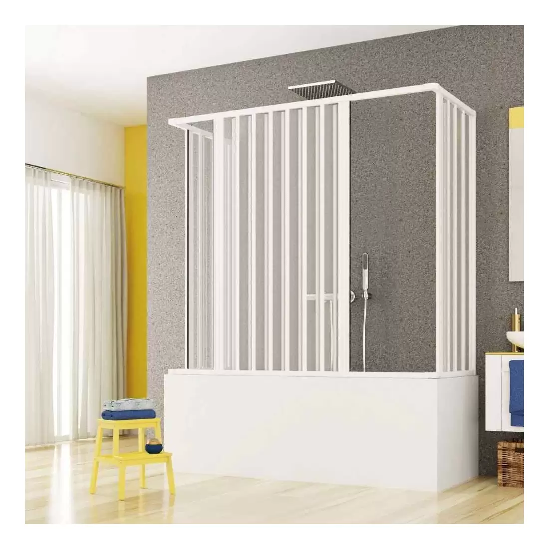 Box vasca a tre lati con tripla anta estensibile a soffietto e chiusura calamitata a tutta altezza. Ampio spazio d’entrata grazie alla doppia apertura ad angolo delle ante.