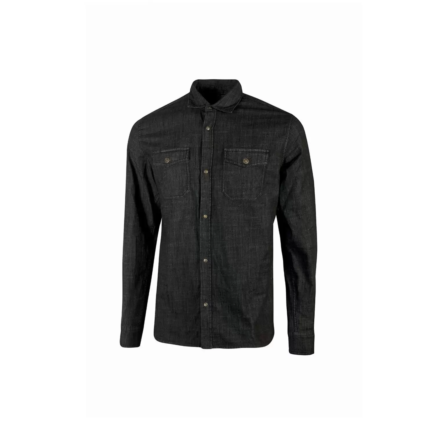 Camicia jeans da lavoro con due tasche applicate sul petto dotate di pattina e chiusura con bottone a pressione; foro porta penne nella tasca destra.