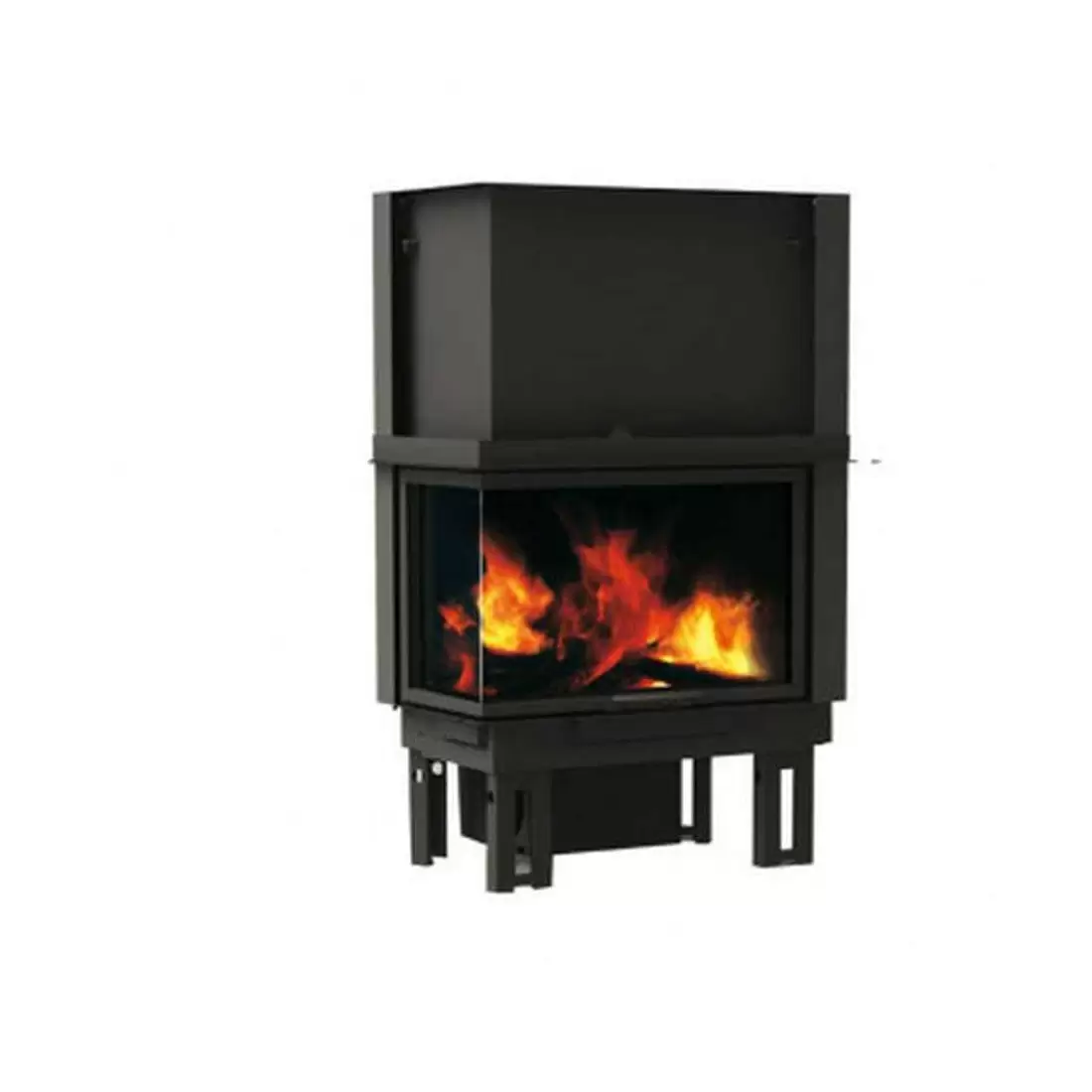 Focolare a ventilazione naturale. Guardando il camino frontalmente, il lato destro va poggiato a parete. Il lato sinistro è vetrato.