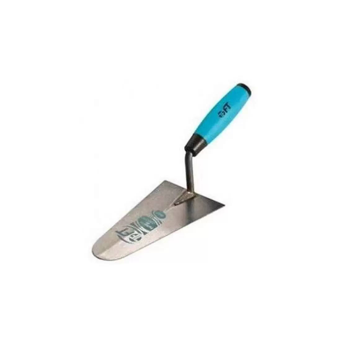 La cazzuola Trial di FT, è lunga 180mm, ed ha punta tonda stretta e impugnatura in gomma.