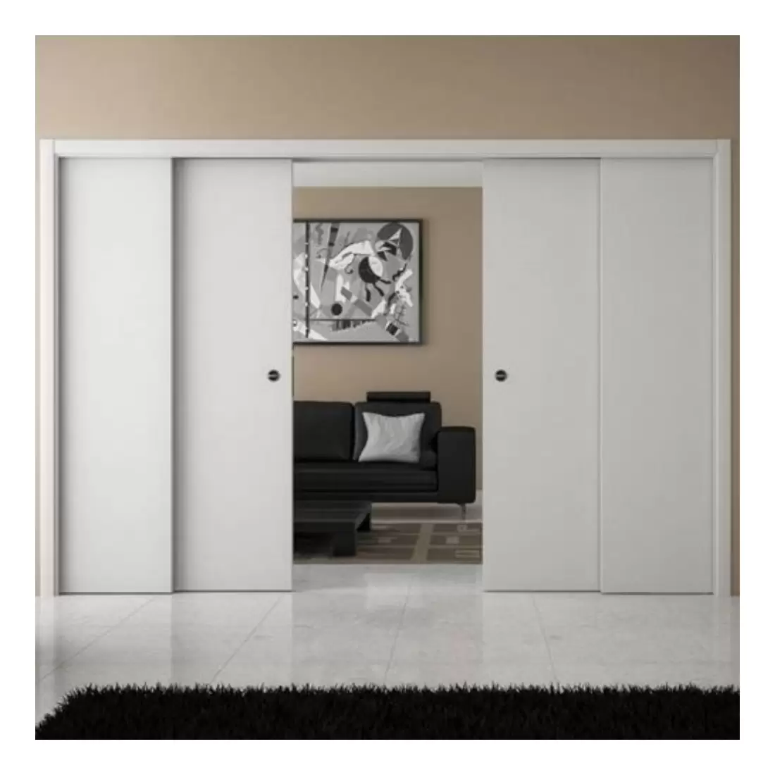 Granluce è il controtelaio concepito per coloro che amano i grandi ambienti: un unico cassonetto consente la scomparsa di due porte scorrevoli parallele collegate tra loro da un sistema a trascinamento.