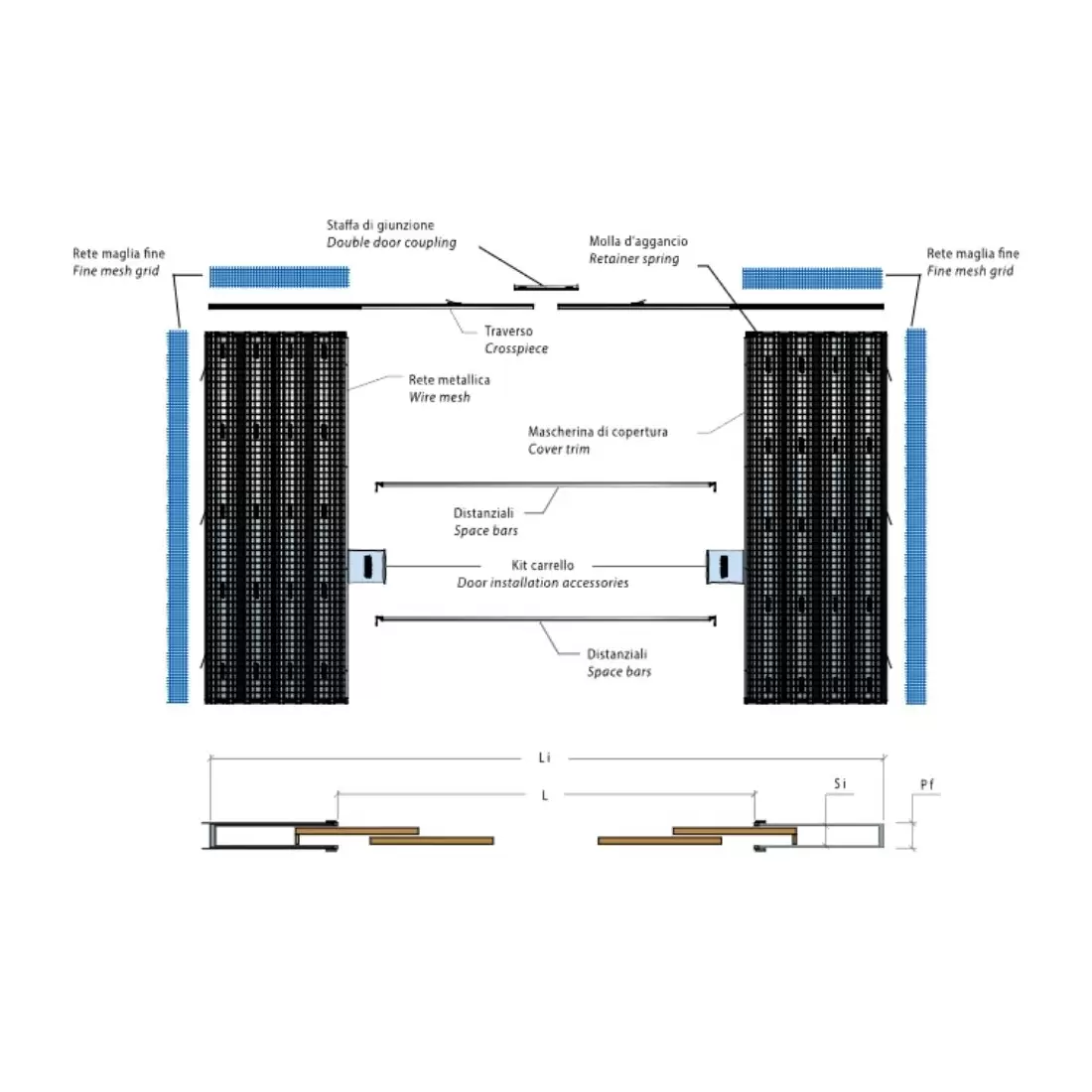 - Dotazione di serie: carrelli portata 150 kg per anta