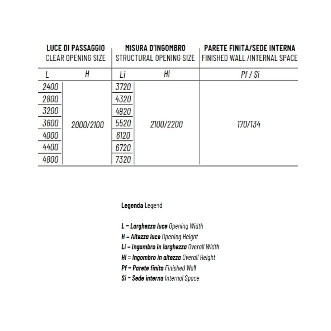 Altezza controtelaio: 200 e 210 cm