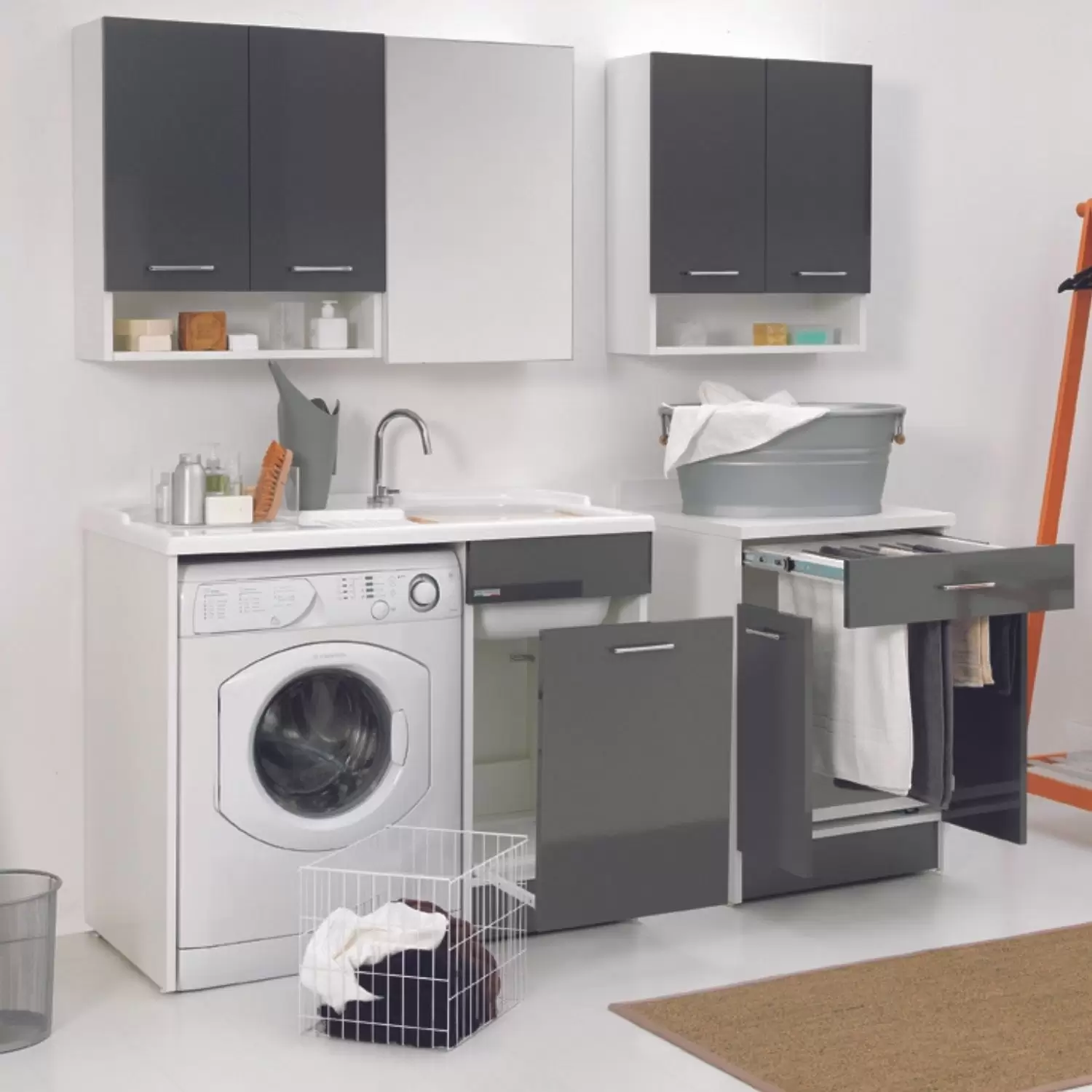 Mobile coprilavatrice Duo di Colavene in truciolare nobilitato 18 mm. Idrofugo a norme EN, frontale in laminato lucido. Dotazione: fornito di cestello portabiancheria scorrevole ed estraibile, tavola lavapanni in legno massello, lavello in ABS metacrilato, vano inserimento lavatrice, sifone e troppopieno, maniglie cromate. Colore mobile: bianco. Colori frontale disponibili su Ediliamo: bianco lucido, melanzana lucido, celeste lucido, antracite lucido