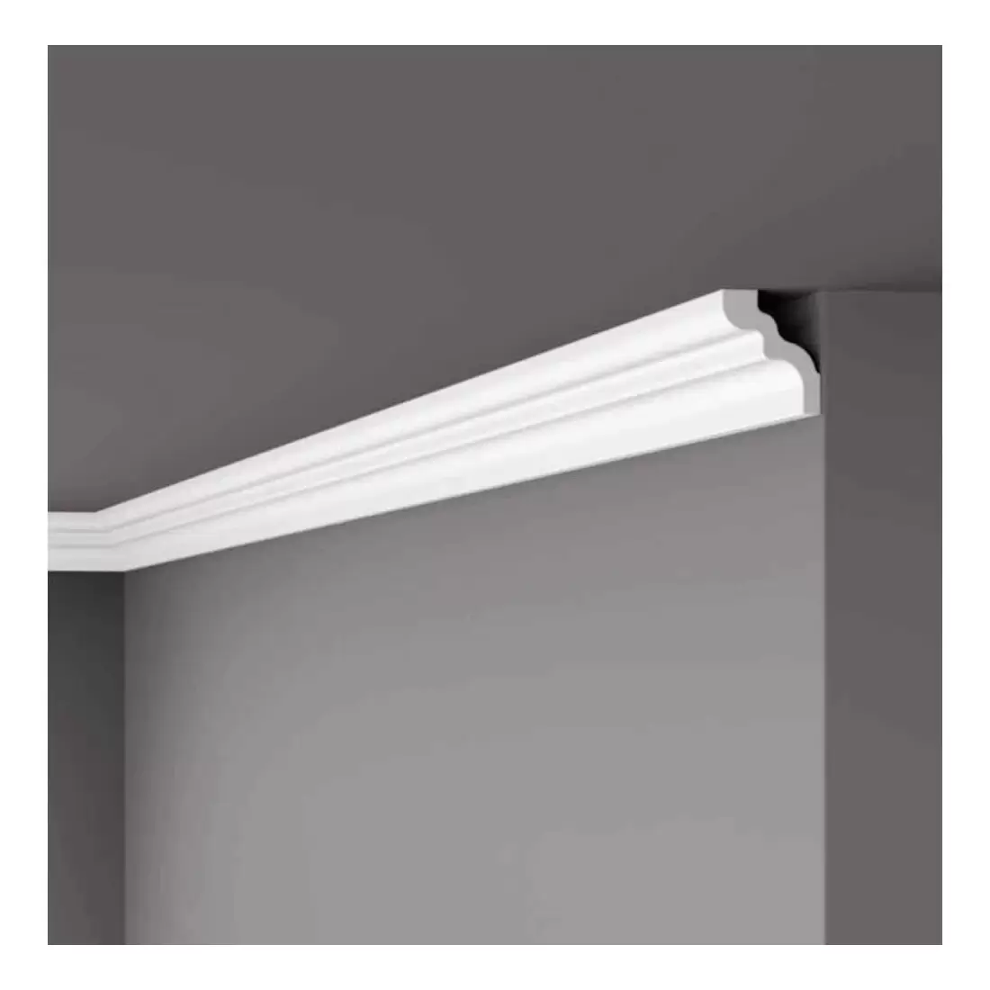 NOMASTYL® D è caratterizzata da una forma arrotondata e concava che genera una morbida transizione tra la parete e il soffitto. Le curve della modanatura NOMASTYL® D evidenziano i profili lineari tipici degli spazi moderni. Anche se la cornice per soffitto D NOMASTYL® è arrotondata, presenta leggere rientranze che aggiungono un valore plastico e coerenza alla stanza.