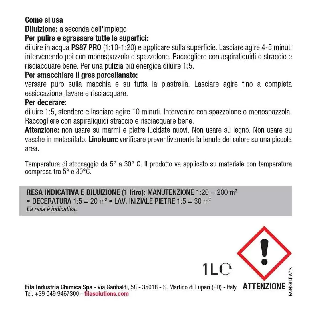 - Diluire in acqua (1:10-1:20) e applicare sulla superficie. Lasciare agire 4-5 minuti intervenendo poi con monospazzola o spazzolone. Raccogliere con aspiraliquidi o straccio e risciacquare bene.Per una pulizia più energica diluire 1:5.Per smacchiare il gres porcellanatoVersare puro sulla macchia e su tutta la piastrella. Lasciare agire fino a completa essiccazione, lavare e risciacquare.Per decerare Diluire 1:5, stendere e lasciare agire 10 minuti. Intervenire con spazzolone o monospazzola. Raccogliere con aspiraliquidi straccio e risciacquare bene.