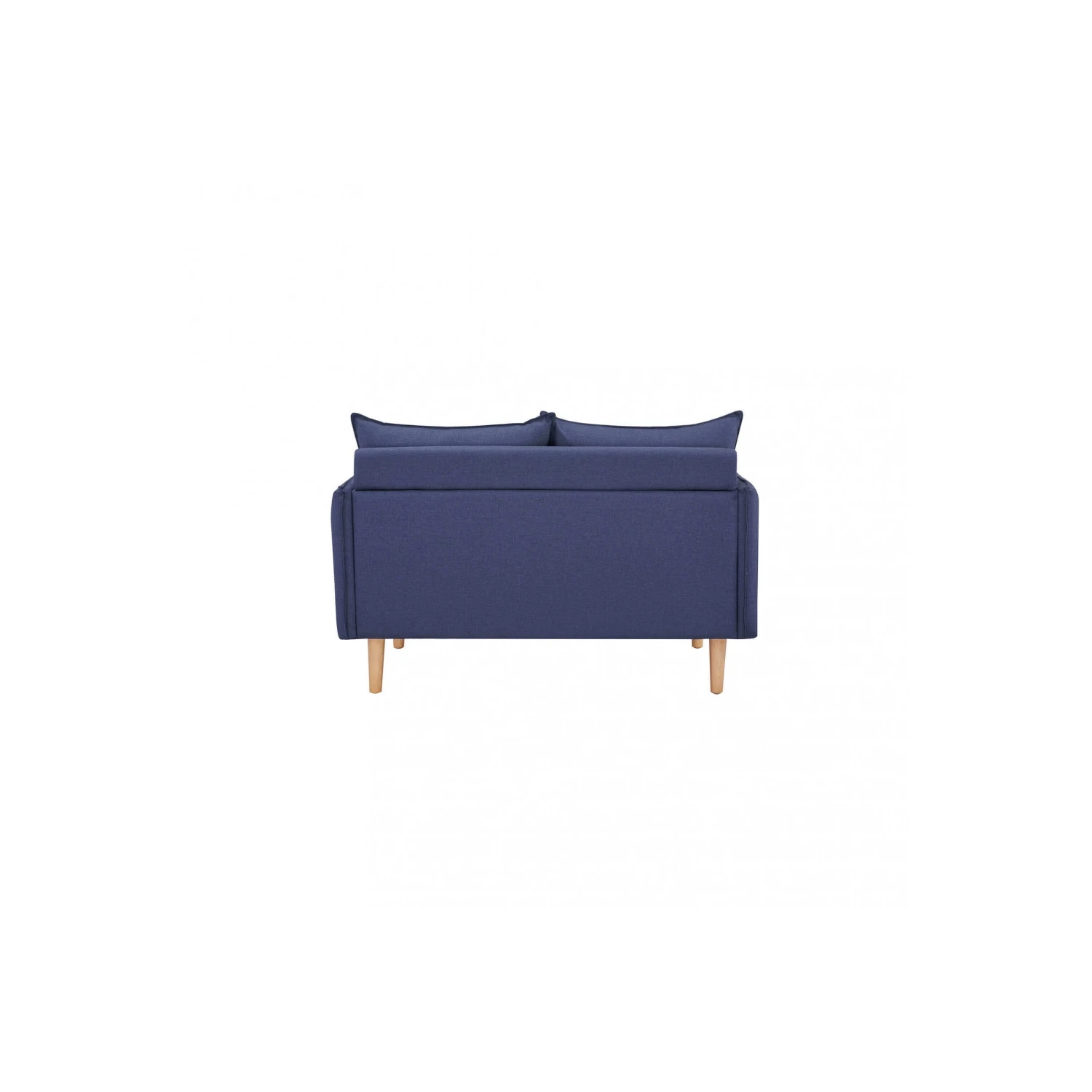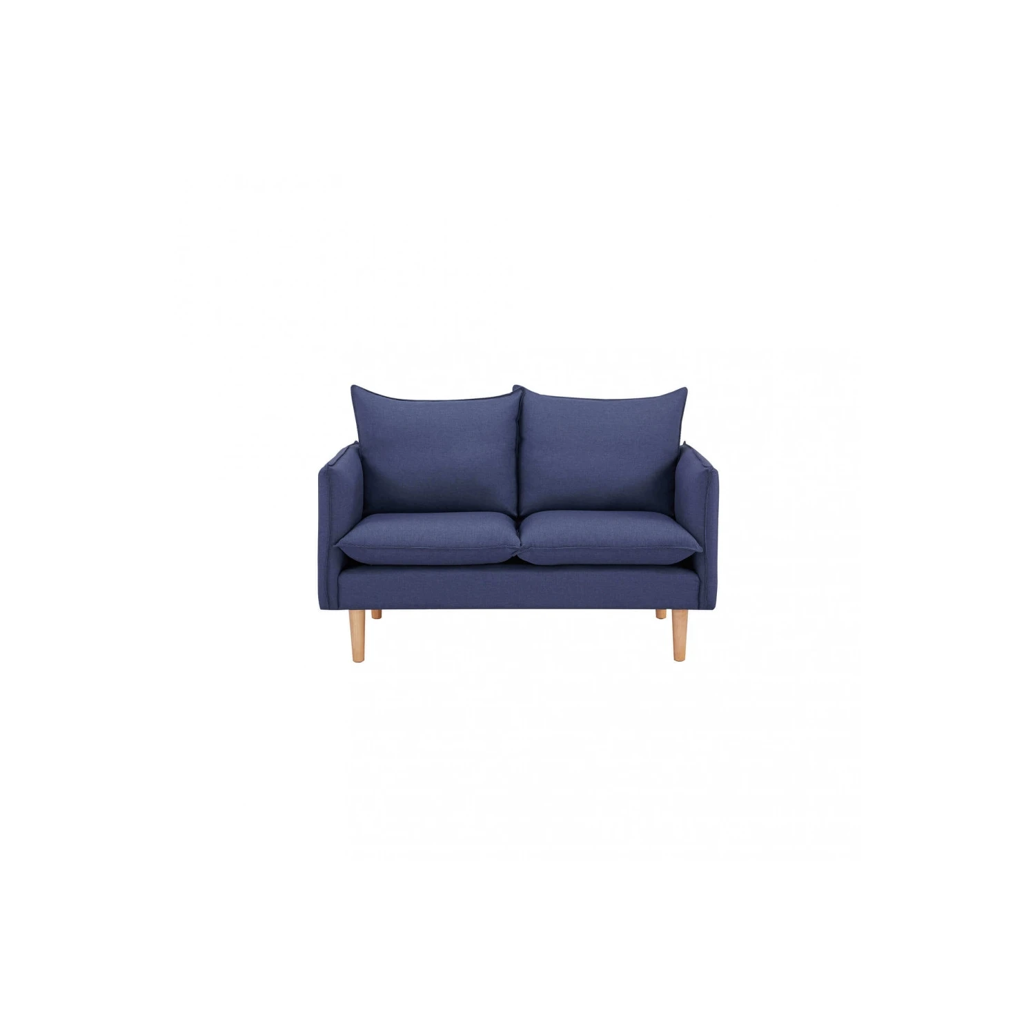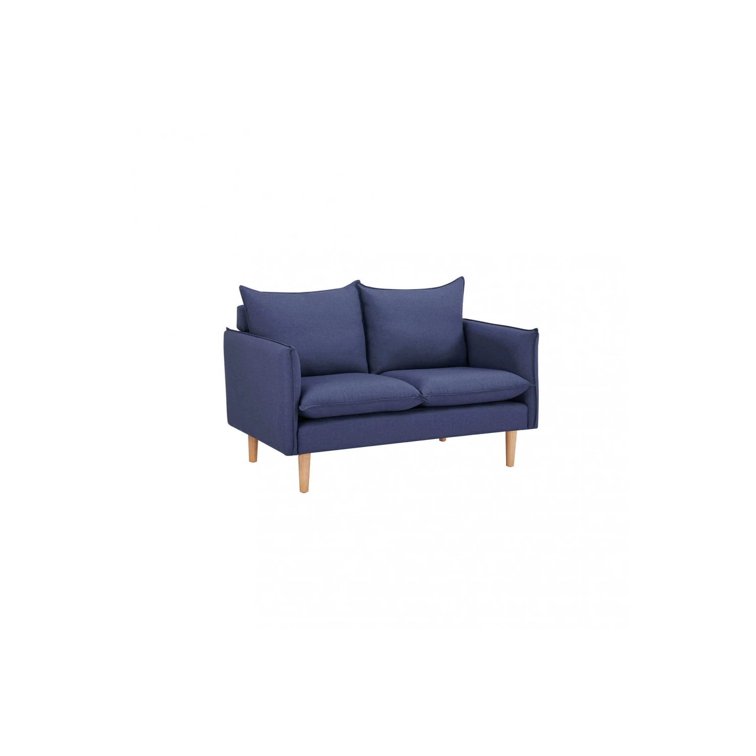 Divano in tessuto blu con gambe in legno. Dimensioni: cm 130 x 84 x 51 h. Posti a sedere: 2