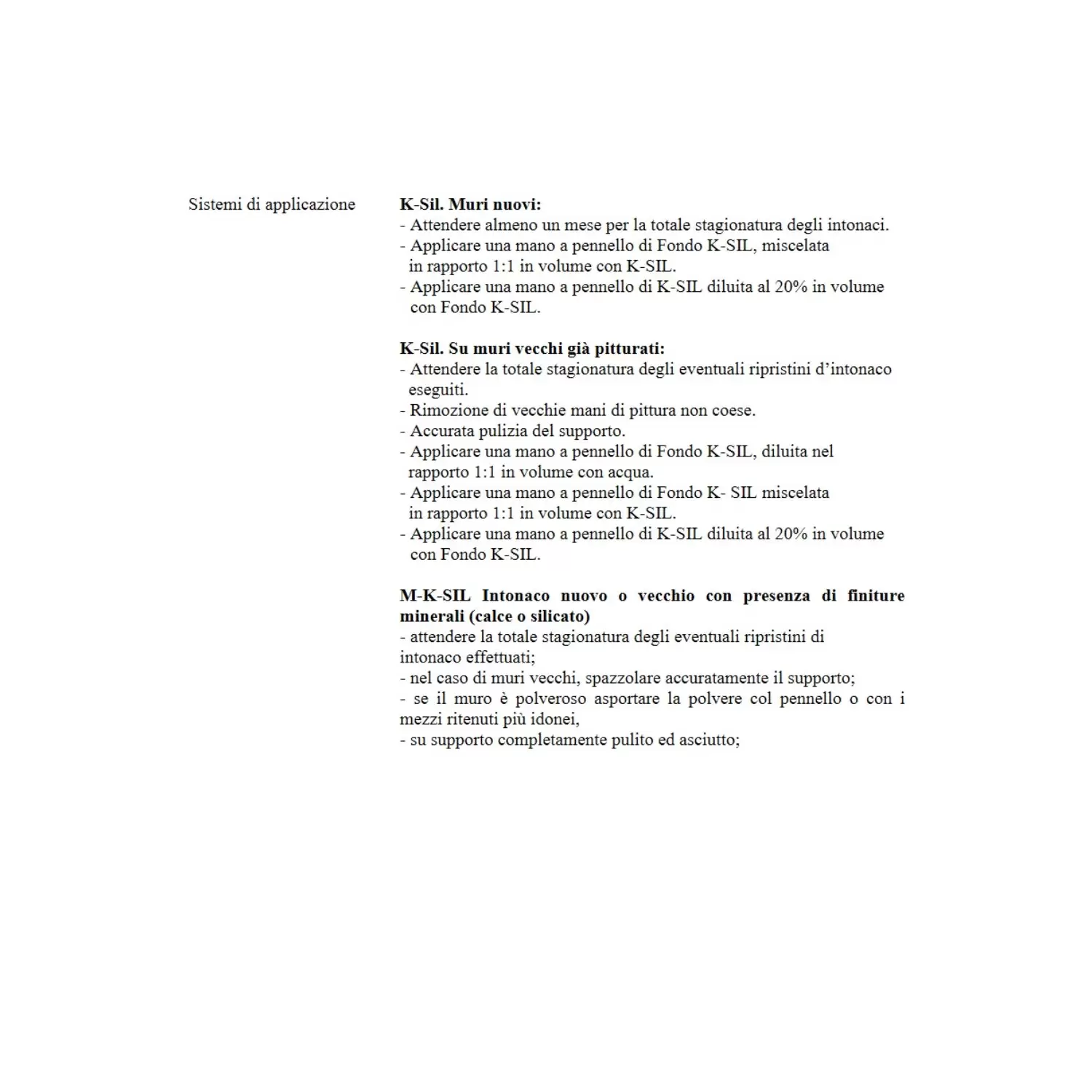 Attendere la totale stagionatura degli eventuali ripristini d’intonaco eseguiti. Rimozione di vecchie mani di pittura non coese. Accurata pulizia del supporto. Applicare una mano a pennello di Fondo K-SIL, diluita nel rapporto 1:1 in volume con acqua. Applicare una mano a pennello di Fondo K- SIL miscelata in rapporto 1:1 in volume con K-SIL. Applicare una mano a pennello di K-SIL diluita al 20% in volume con Fondo K-SIL.