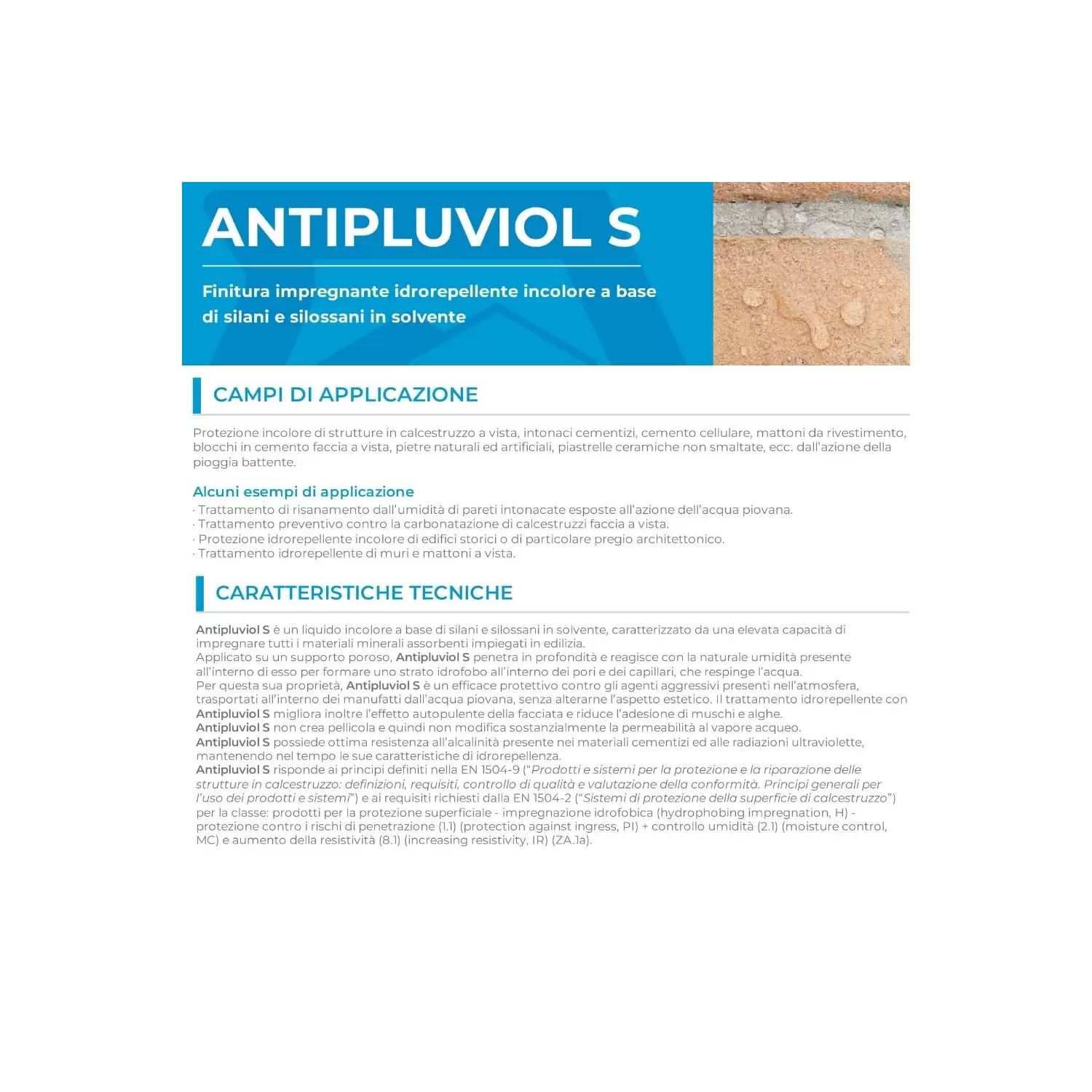 Protezione incolore di strutture in calcestruzzo a vista, intonaci cementizi, cemento cellulare, mattoni da rivestimento, blocchi in cemento faccia a vista, pietre naturali ed artificiali, piastrelle ceramiche non smaltate, ecc. dall’azione della pioggia battente.