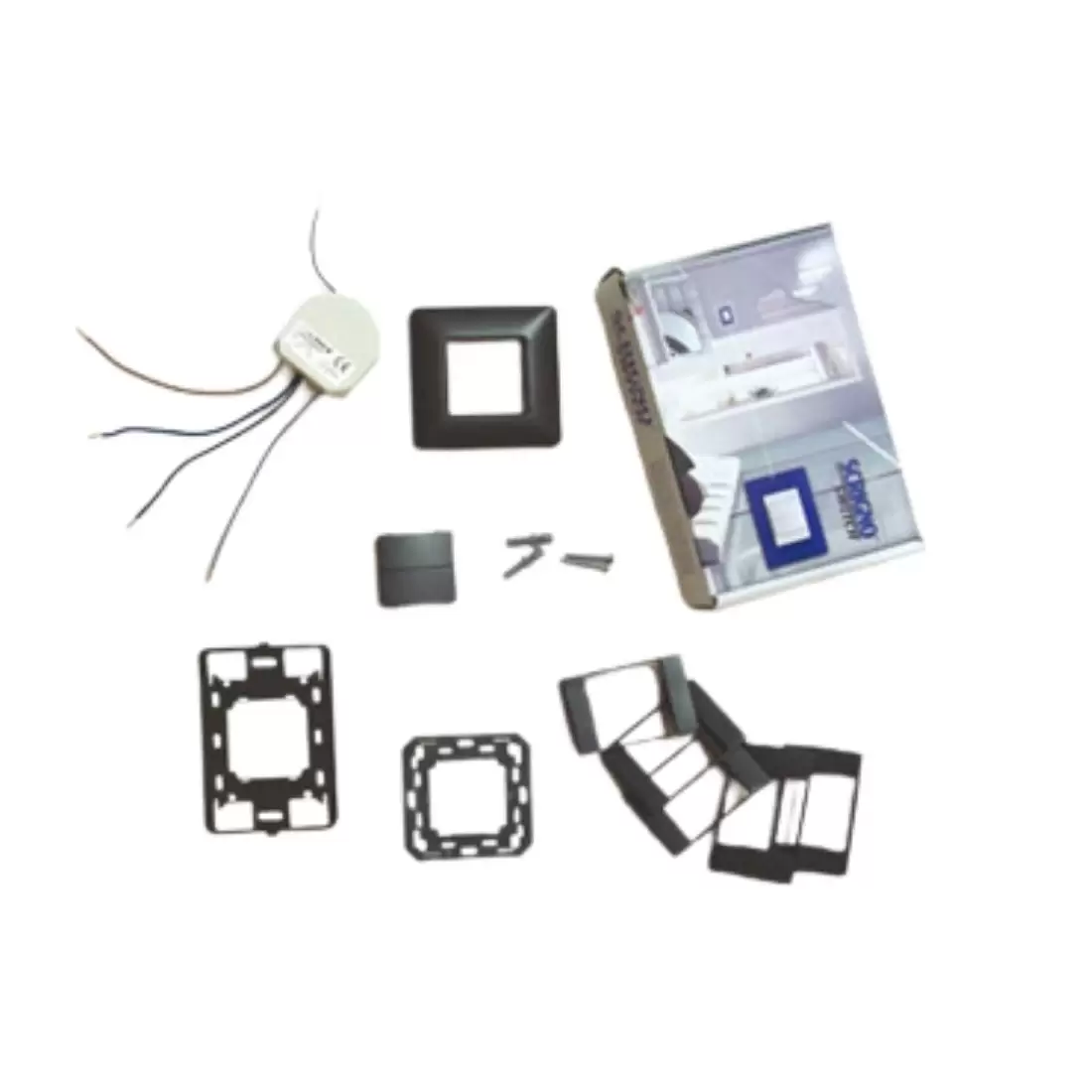 - n.1 kit di 5 adattatori che servono per utilizzare le placche standard più comunemente diffuse e che si trovano facilmente in commercio. Questo permette di montare sull’interruttore in radiofrequenza le stesse placche degli interruttori cablati tradizionali. Il kit è disponibile nella versione bianco