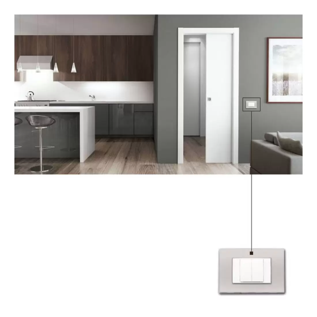 SCRIGNO Switch è l‘interruttore in radiofrequenza per comandare l’accensione e/o lo spegnimento di un nuovo punto luce. È la soluzione ideale in tutte quelle situazioni dove non è possibile installare un impianto cablato tradizionale per via della mancanza di spazio nella parete, come ad esempio in presenza di controtelai.