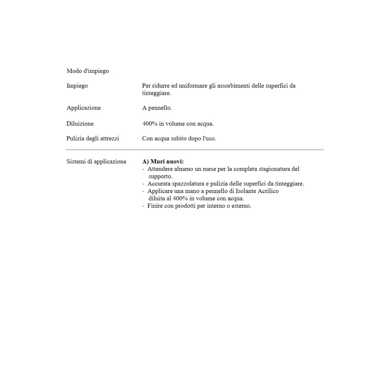 Attendere almeno un mese per la completa stagionatura del supporto. Accurata spazzolatura e pulizia delle superfici da tinteggiare. Applicare una mano a pennello di Isolante Acrilico diluita al 400% in volume con acqua. Finire con prodotti per interno o esterno.