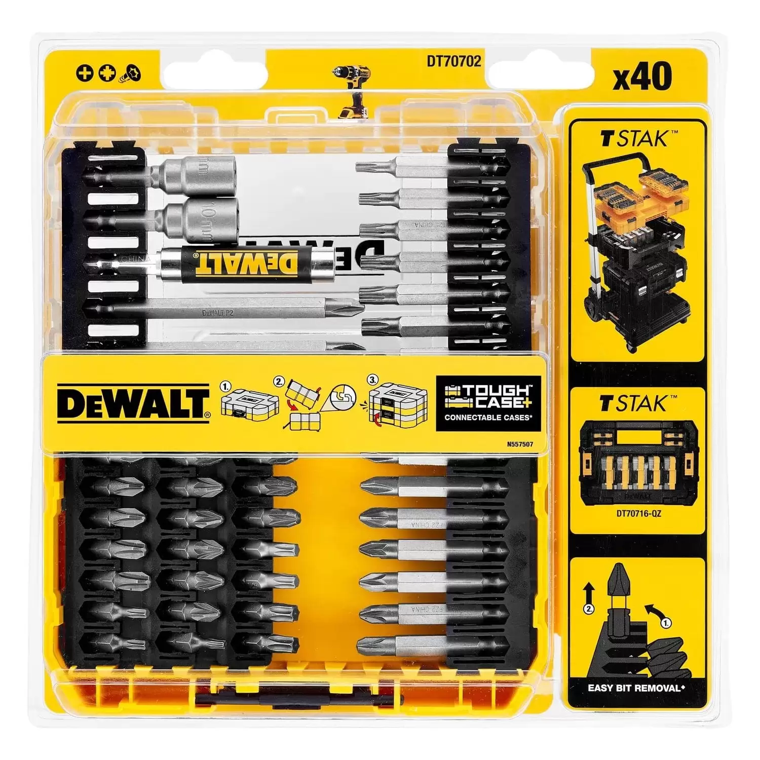 Set di 40 pezzi per avvitare DeWalt DT70702 con bussole, adattatori ed inserti misti.