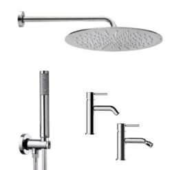 Kit composto da: Miscelatore lavabo + miscelatore bidet + soffione doccia + duplex doccia. Finitura cromata