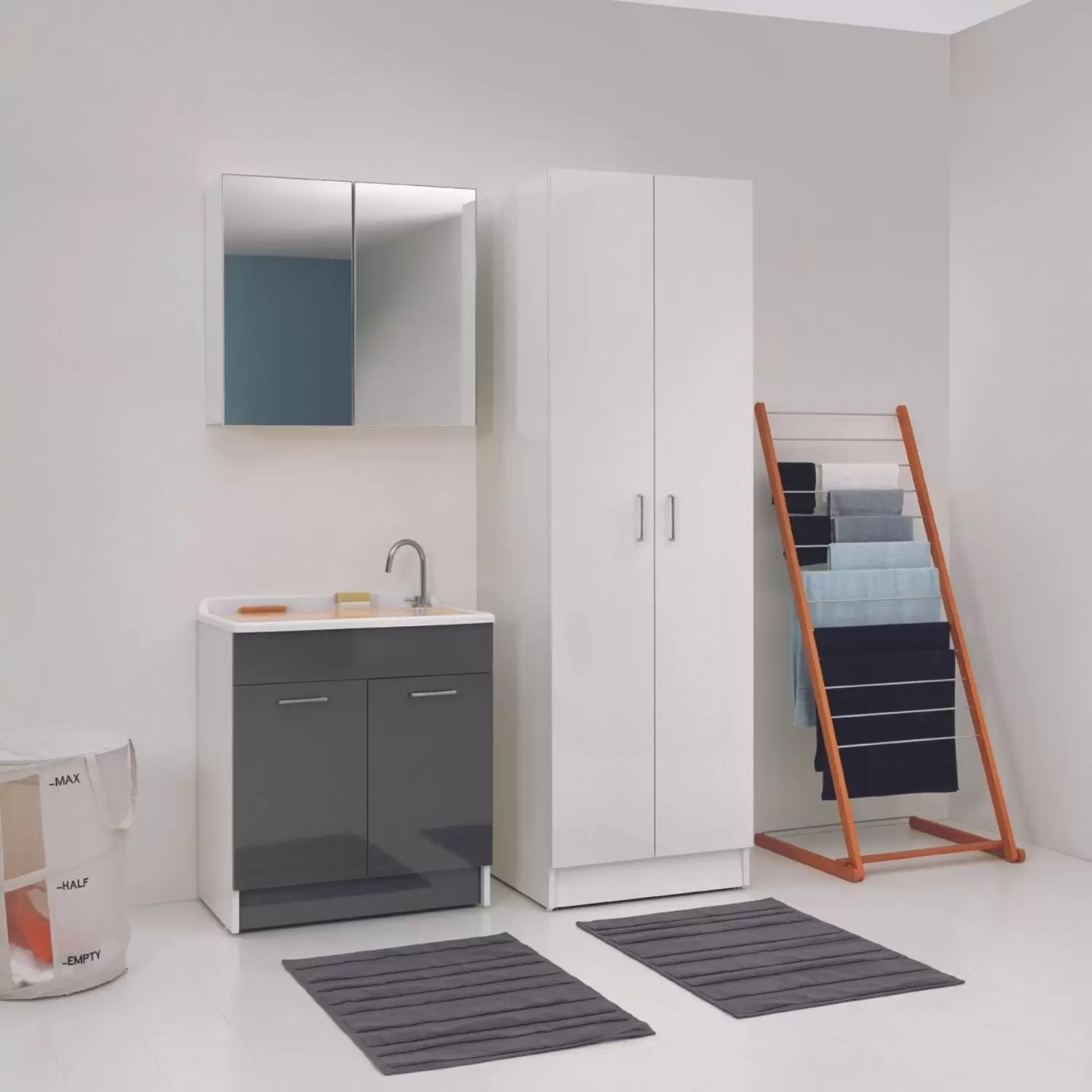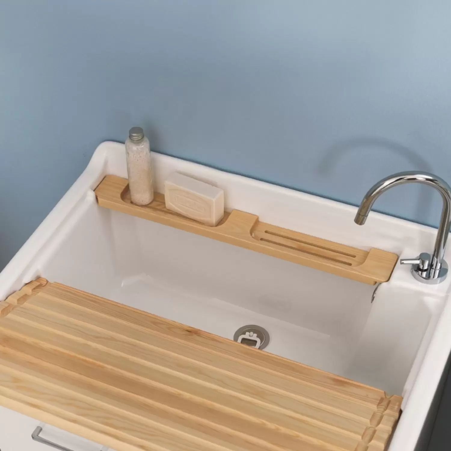 Mobile lavanderia Lindo Max di Colavene in truciolare nobilitato 18 mm. Idrofugo a norme EN, frontale in laminato lucido. Dotazione: fornito completo di cestello portabiancheria e griglia, tavola in legno massello, lavatoio in ABS metacrilato, sifone e troppopieno, maniglie cromate. Colore mobile: bianco. Colori frontali disponibili: bianco lucido, melanzana lucido, celeste lucido, antracite lucido.