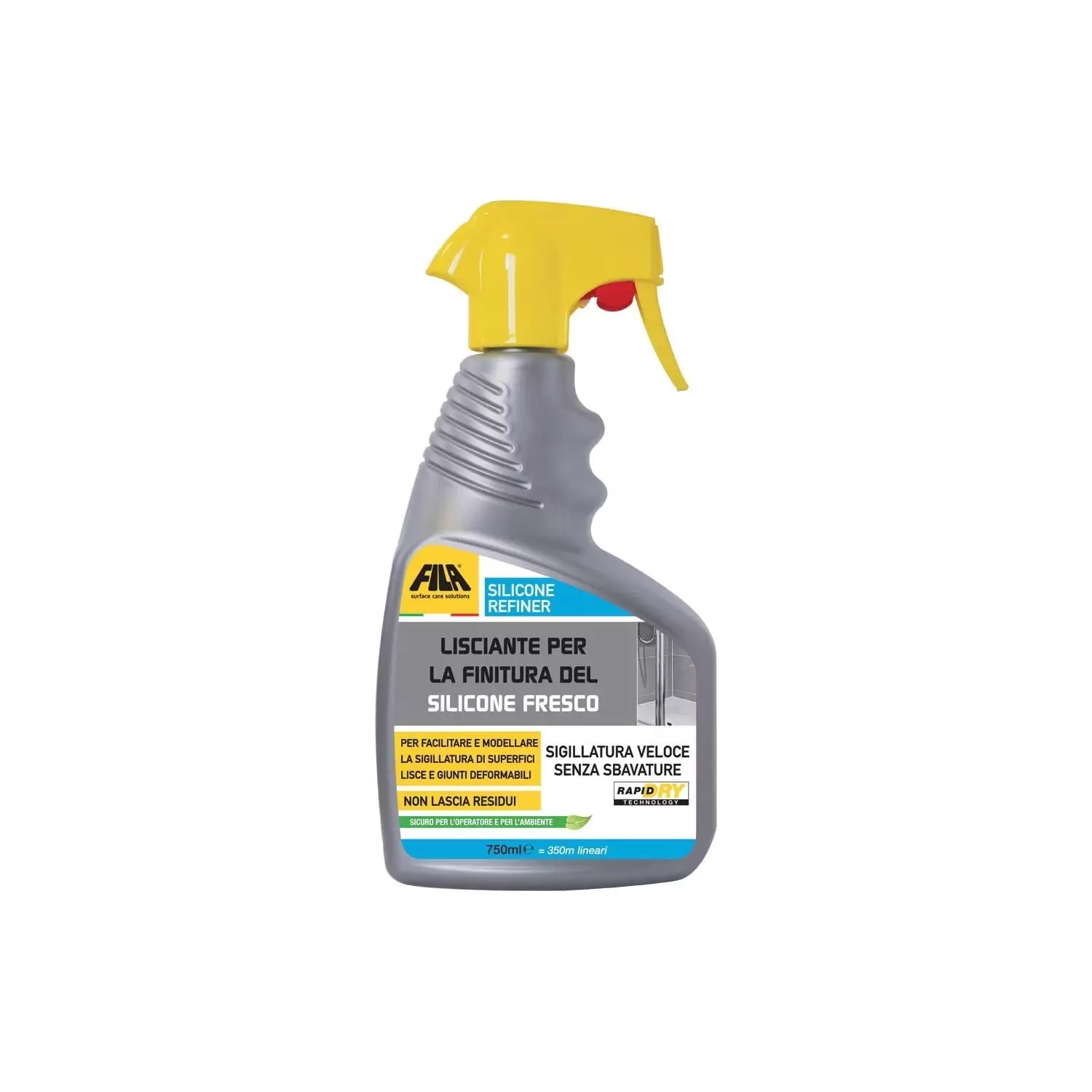 Una volta steso il sigillante, prima che lo stesso formi la pellicola superficiale, spruzzare SILICONE REFINER sul giunto. Eseguire la finitura usando la spatola FILA più adatta all’angolatura del giunto. Nel caso delle sagome radiali è consigliabile, dopo aver spruzzato nuovamente SILICONE REFINER, ripassare il sigillante per livellare eventuali imperfezioni.