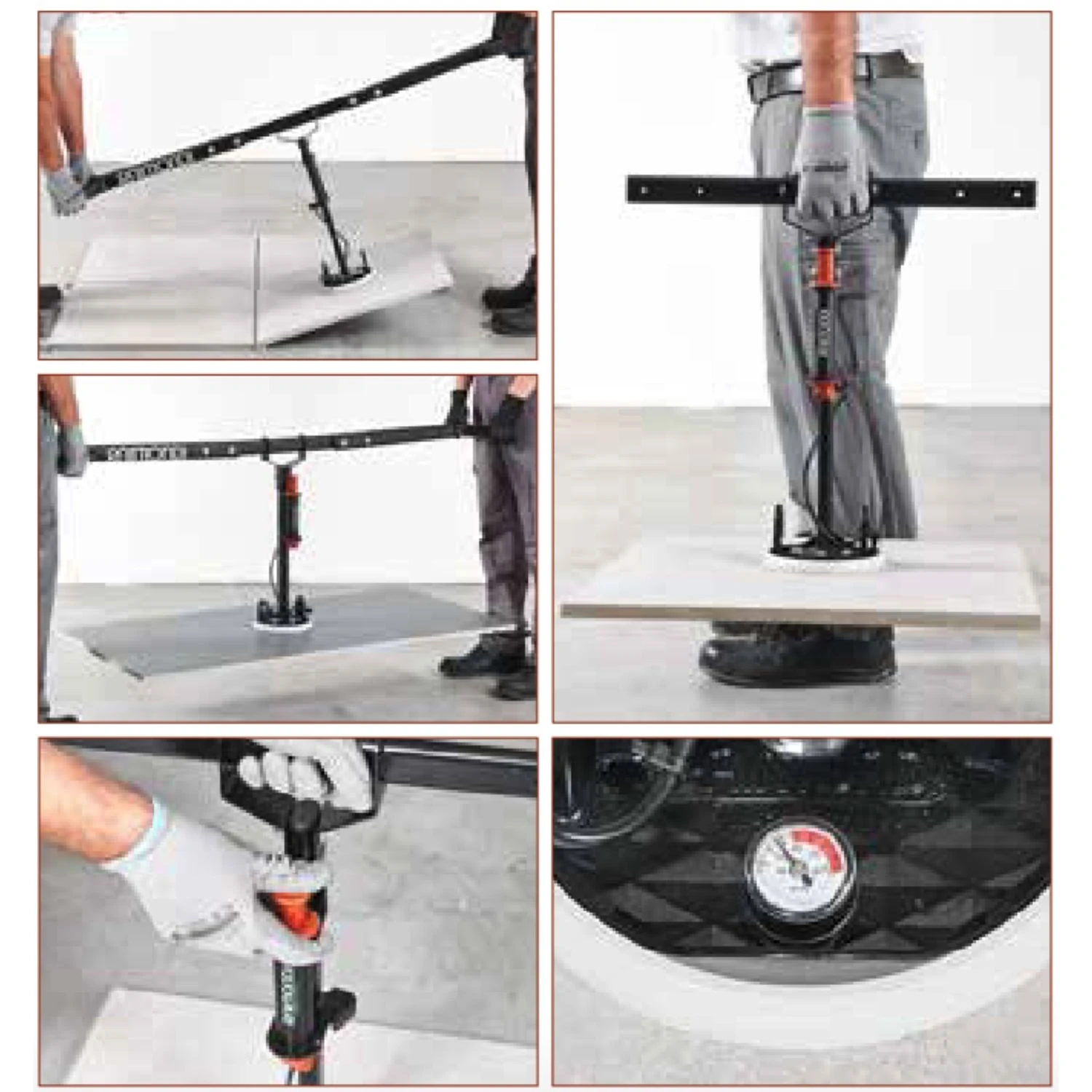 TSS è munito di ventosa a pompa Ø 175 mm con vuotometro. Gomma tri labbro sostituibile. Vuotometro sostituibile. Ventosa a pompa progettata per la movimentazione di piastrelle ceramiche sia lisce che strutturate. La ventosa è inoltre idonea al sollevamento di qualsiasi materiale non poroso quali marmi, graniti, vetro, ecc…