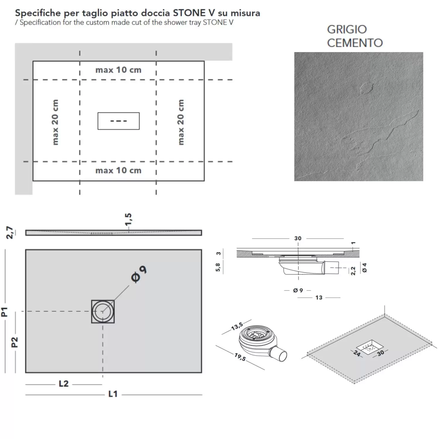 - Altezza piatto doccia: 3 cm