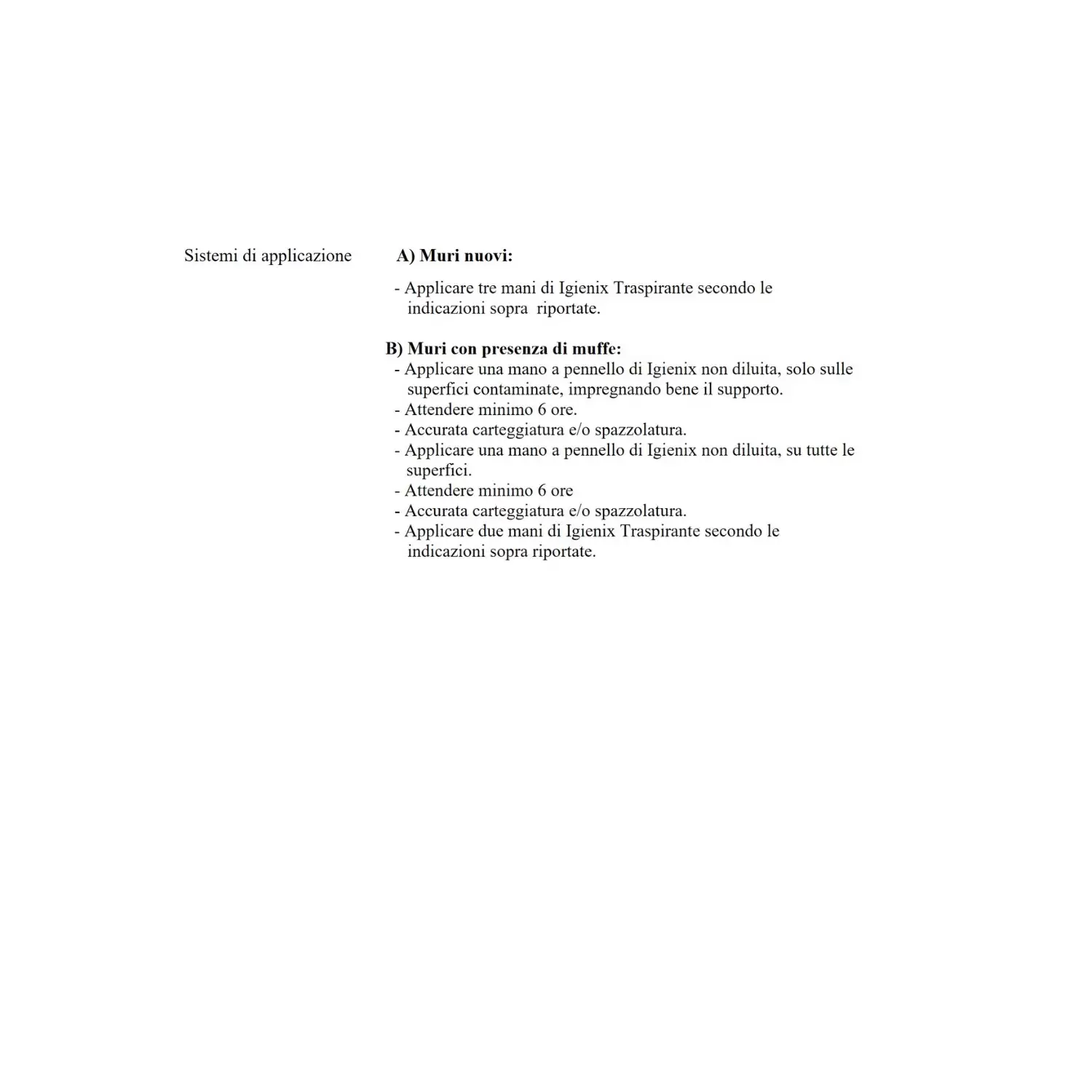 Applicare una mano a pennello di Igienix non diluita, solo sulle superfici contaminate, impregnando bene il supporto. Attendere minimo 6 ore. Accurata carteggiatura e/o spazzolatura. Applicare una mano a pennello di Igienix non diluita, su tutte le superfici. Attendere minimo 6 ore Accurata carteggiatura e/o spazzolatura. Applicare due mani di Igienix Traspirante secondo le indicazioni sopra riportate.