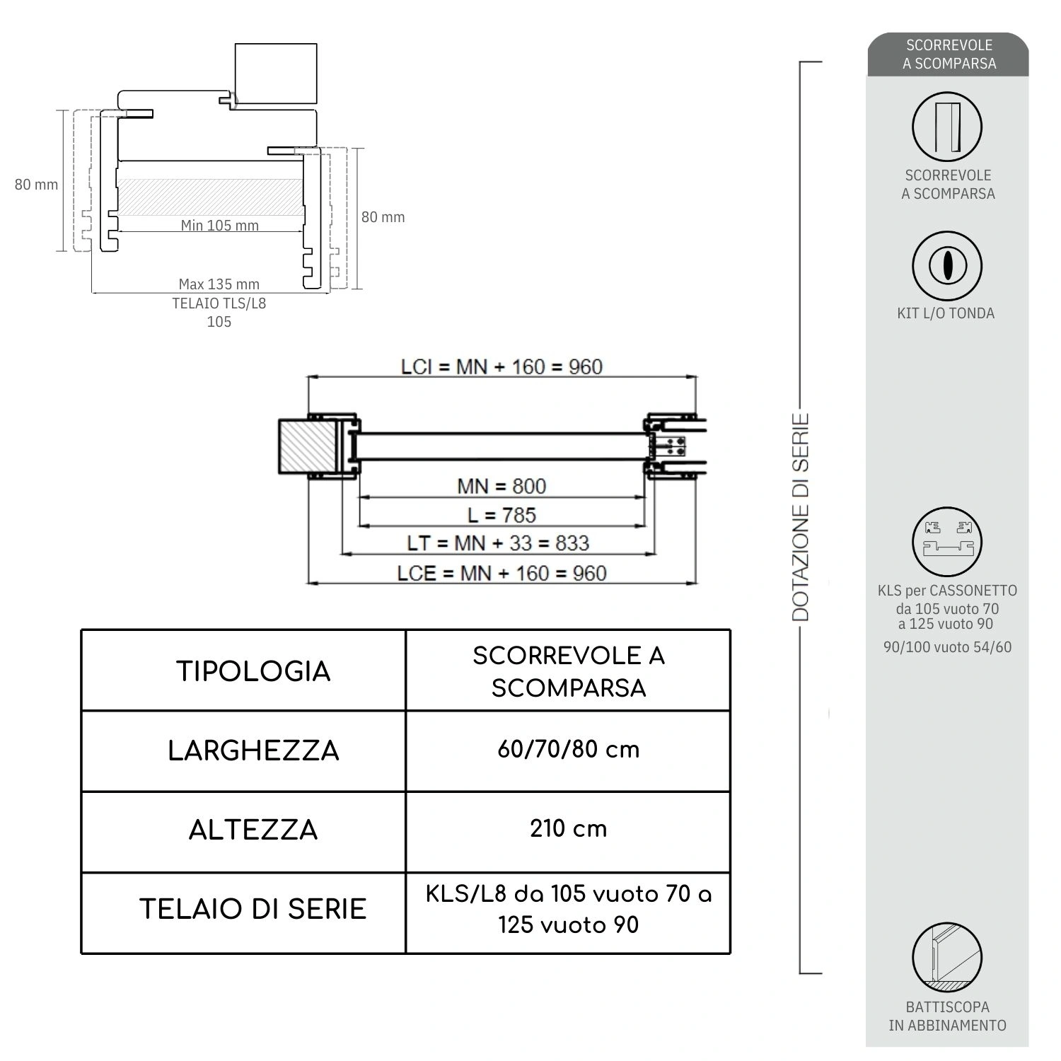 | MISURA PORTA | 60 x 210 cm, 70 x 210 cm, 80 x 210 cm, 90 x 210 cm |
