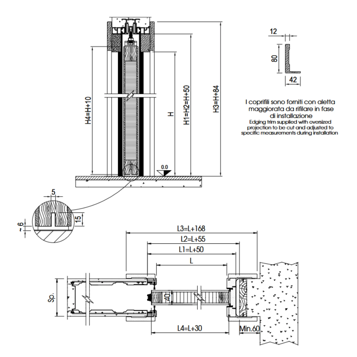- Coprifili: piatti, larghezza 80 mm, spessore 12 mm, fresata a 4 mm dal bordo