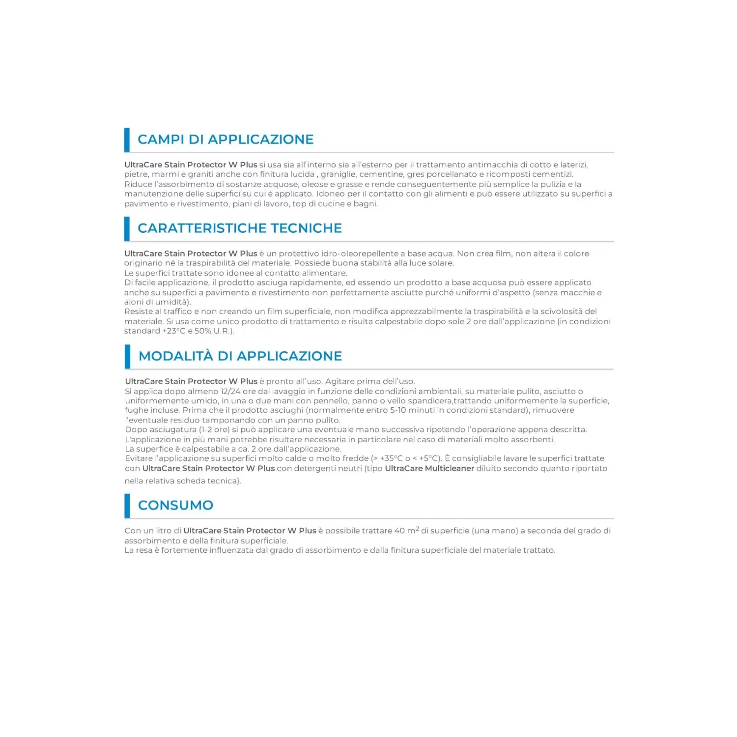 UltraCare Stain Protector W Plus si usa sia all’interno sia all’esterno per il trattamento antimacchia di cotto e laterizi, pietre, marmi e graniti anche con finitura lucida , graniglie, cementine, gres porcellanato e ricomposti cementizi. Riduce l’assorbimento di sostanze acquose, oleose e grasse e rende conseguentemente più semplice la pulizia e la manutenzione delle superfici su cui è applicato. Idoneo per il contatto con gli alimento e può essere utilizzato su superfici a pavimento e rivestimento, piani di lavoro, top di cucine e bagni