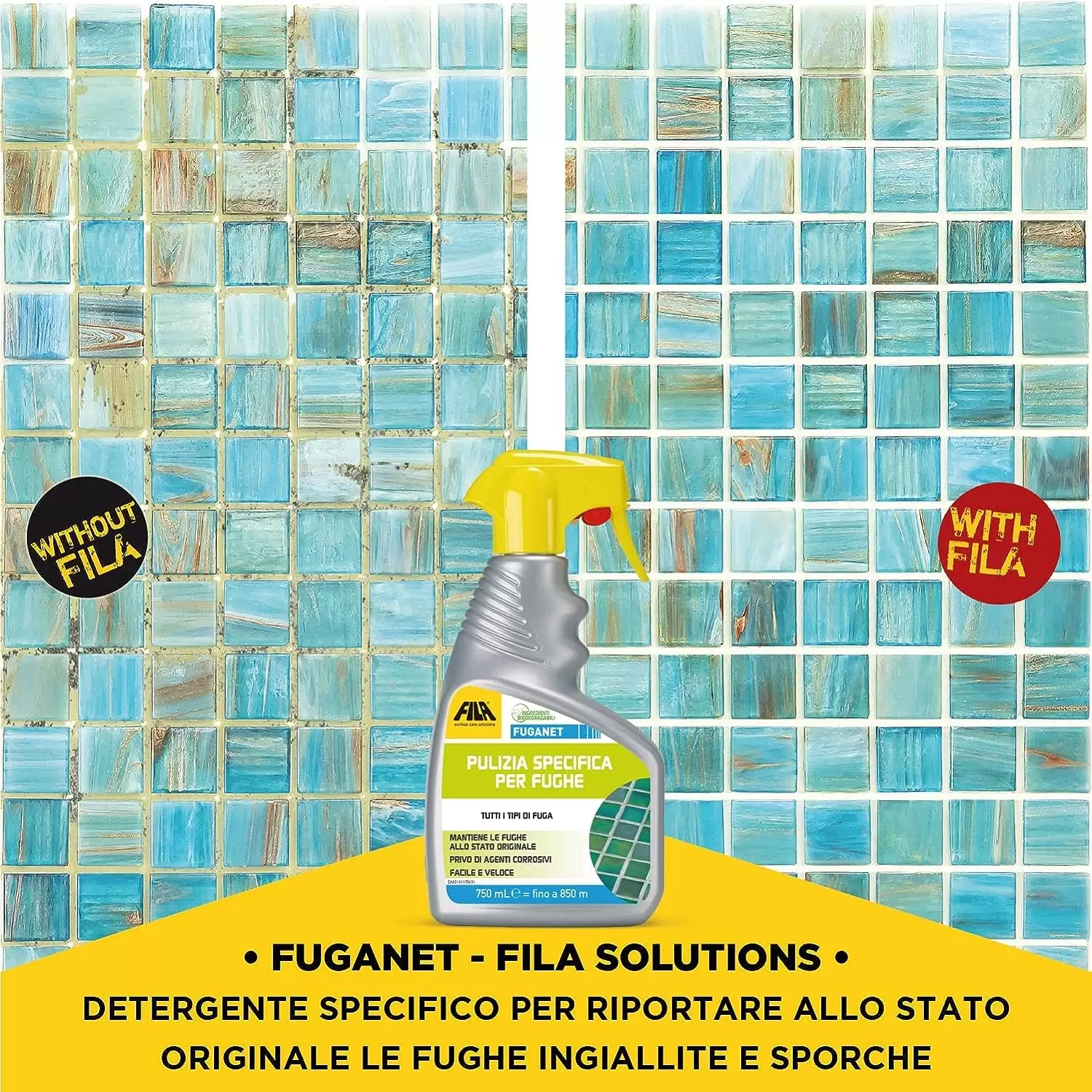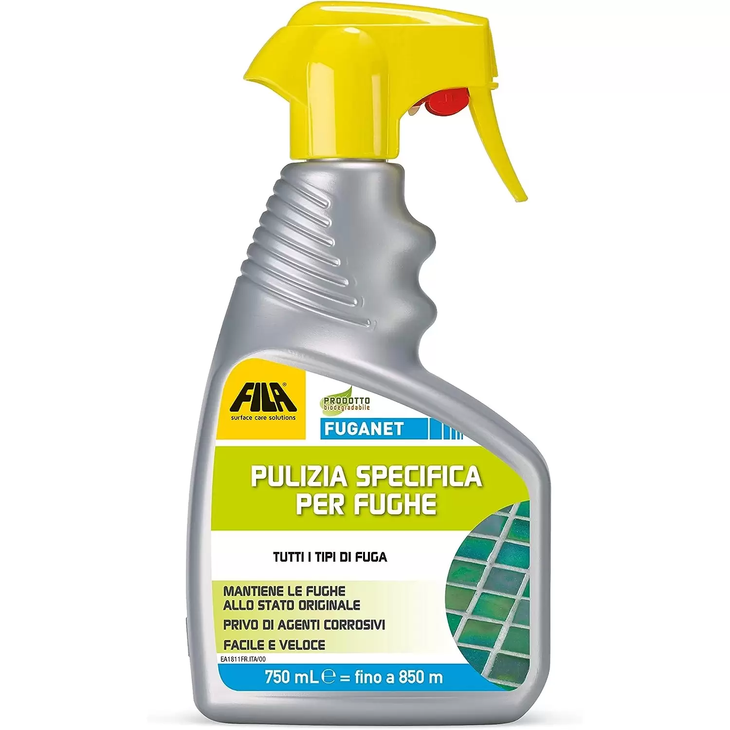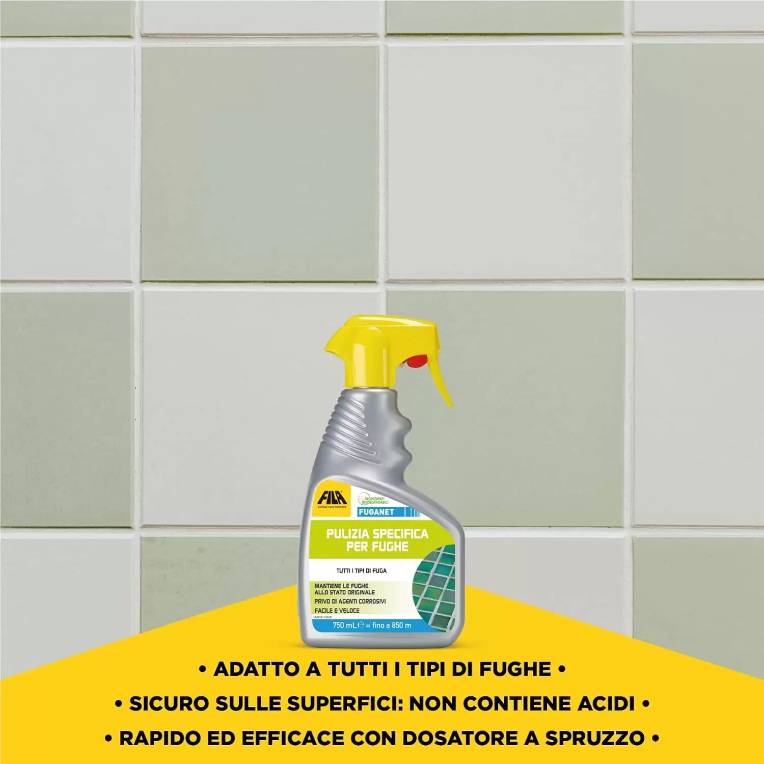 - Applicazione: Spruzzare FUGANET direttamente sulla fuga. Lasciare agire qualche minuto e pulire strofinando con una spugna abrasiva o spazzolone. Nel caso di fughe molto sporche si consiglia di effettuare una prima pulizia più profonda utilizzando PULIZIA DISINCROSTANTE o DETERDEK PRO, diluito 1:10.