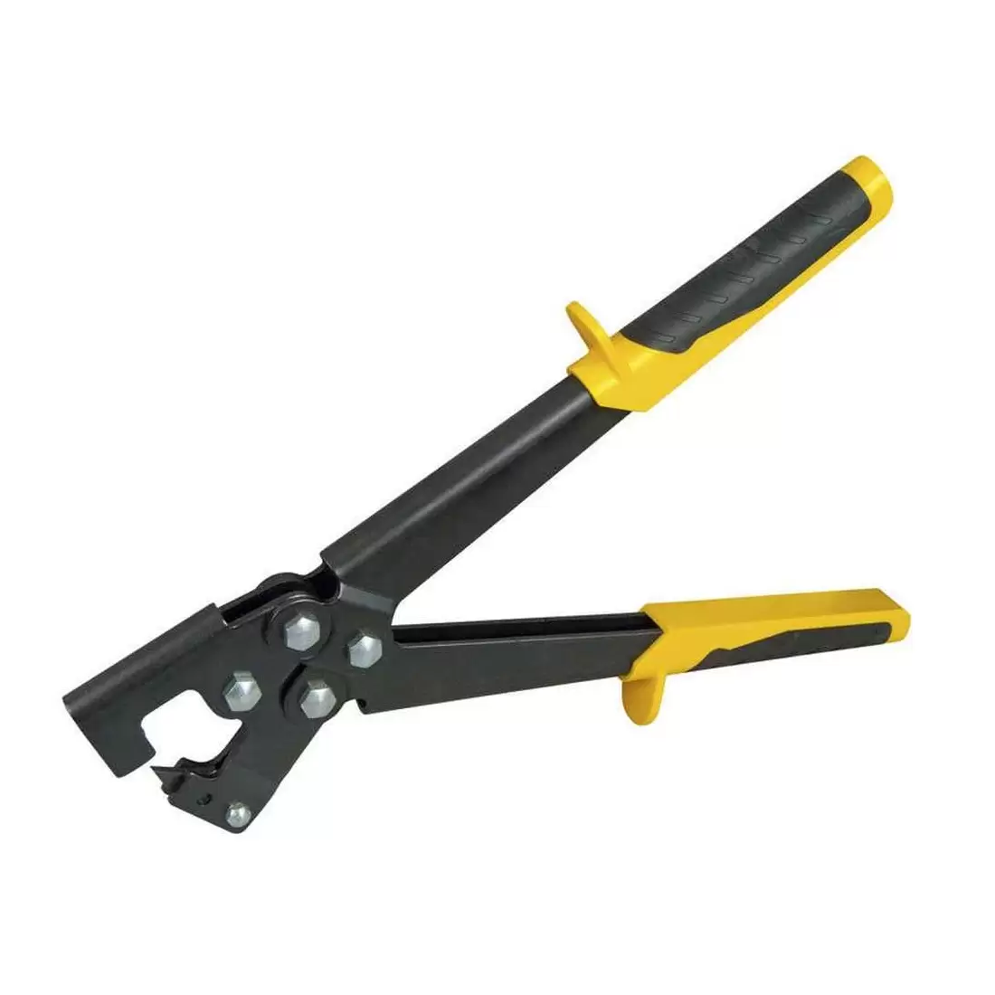 La punzonatrice in acciaio 15-273 della Stanley, fissa profili e montanti in alluminio a “U”. L’utensile ripiega due strisce di lamiera praticando un taglio rettangolare.