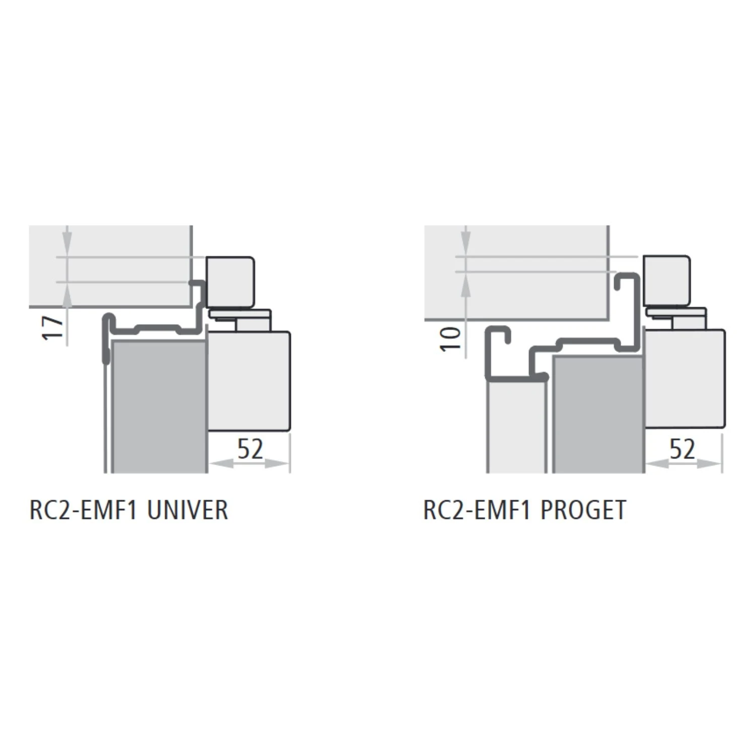 Il sistema RC2-EMF1 è idoneo all’uso su porte tagliafuoco ed è classifi cato per entrambi i chiudiporta con forza EN 4. Larghezza minima foro muro di 1200 mm e minima dell’anta secondaria di 370 mm. Le porte Proget ordinate con RC2-EMF1 sono predisposte con i fori di fi ssaggio sulle ante e sul telaio. Le porte Uni- ver prevedono di serie il rinforzo interno per l’applicazio- ne dei due chiudiporta.