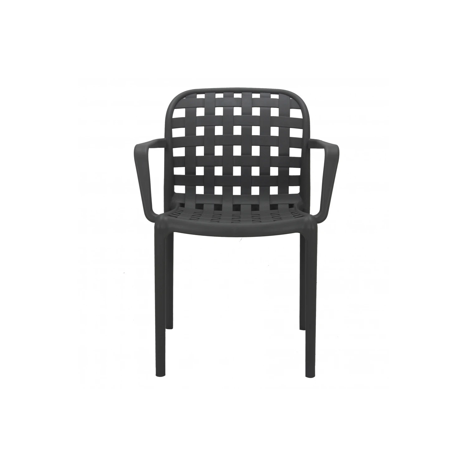 Sedia impilabile con braccioli in polipropilene antracite. Dimensioni: cm 58 x 57,5 x 82,5 h