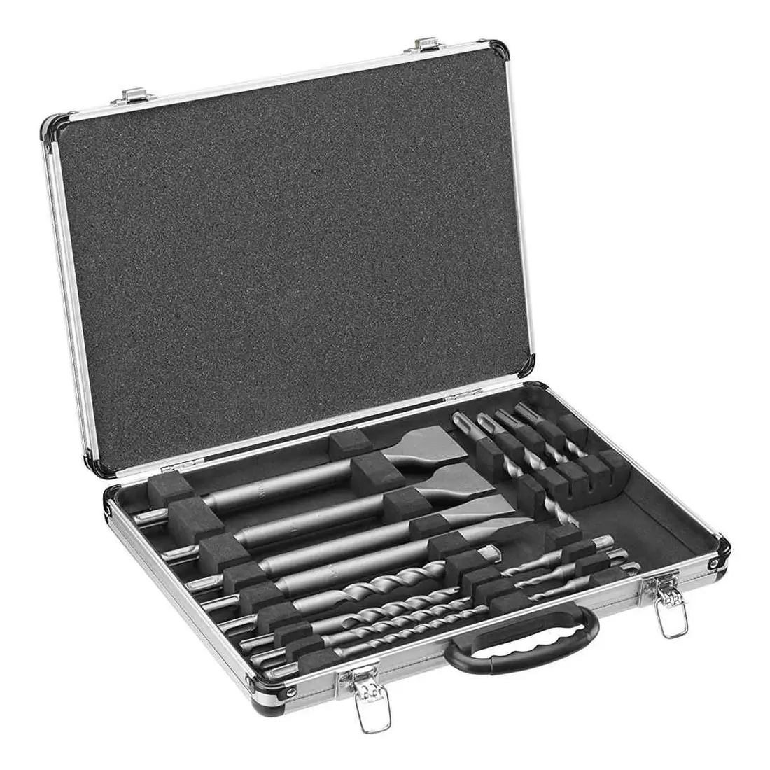Contenuto della confezione: 4 scalpelli piatti, 1 scalpello a punta, 10 punte SDS-plus ad alte prestazioni Ø 5, 5.5, 6, 7, 8, 10, (110 mm) / Ø 6, 8, 10 (160 mm) / Ø 14 mm x 210 mm.