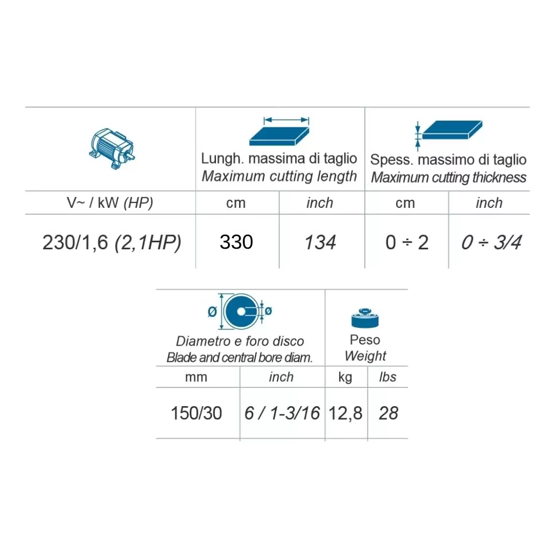 - Spessore massimo di taglio: 20 mm