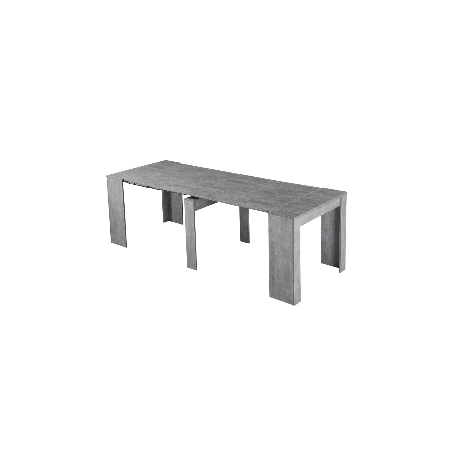 Tavolo in melamina. Colore: grigio effetto cemento. Allunghi possibili: 50/100/150/200/250/300. Altezza: 75 cm. Larghezza: 90 cm. Lunghezza minima da chiuso: 50 cm. Lunghezza massima: 300 cm.